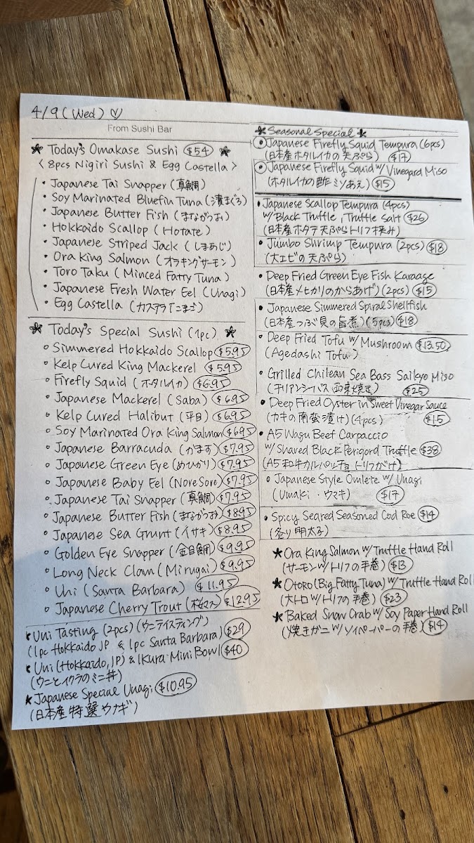 The menu allows visitors to explore a range of textures and flavors typical of Japanese cuisine, making it suitable for casual dining and those looking for a mix of raw and cooked seafood options. The variety supports both individual dishes and combinations that can be shared.